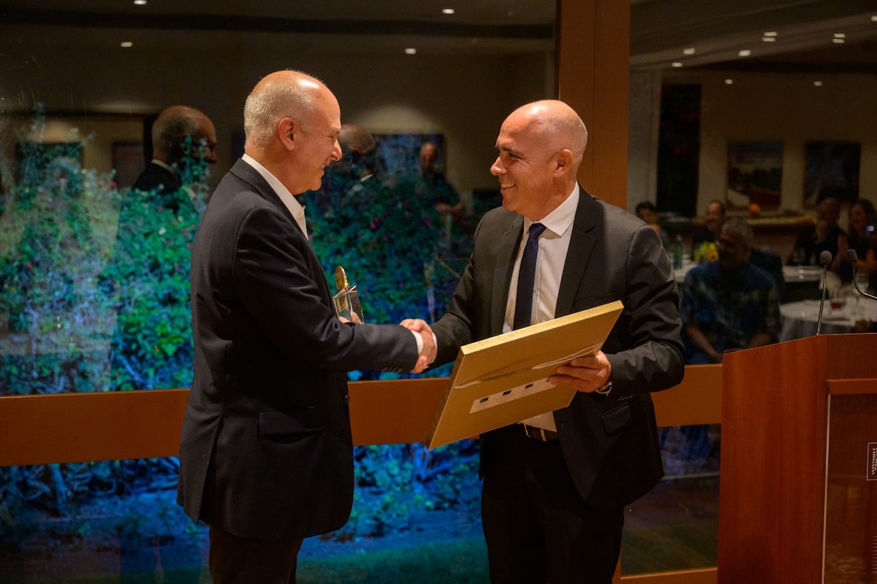 Bruno Mariani recebe a premiação do presidente do Instituto Weizmann, Alon Chen. Foto: Instituto Weizmann.