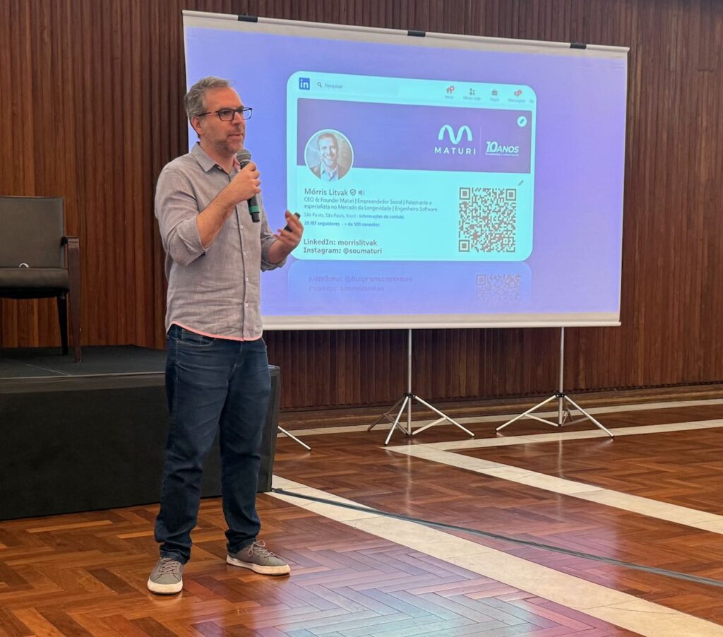 Fundador da Maturi — plataforma referência em recolocação e empreendedorismo para pessoas acima de 50 anos — Mórris Litvak apresentou dados do mercado e trouxe dicas práticas para quem busca recolocação. “O mais importante é estar aberto a mudanças e aprender coisas novas sempre. Não dá para ficar parado achando que só existe uma forma de trabalhar. Mesmo quem tem dificuldade digital consegue aprender — basta buscar ajuda, cursos e profissionais. Superar o medo é fundamental.”