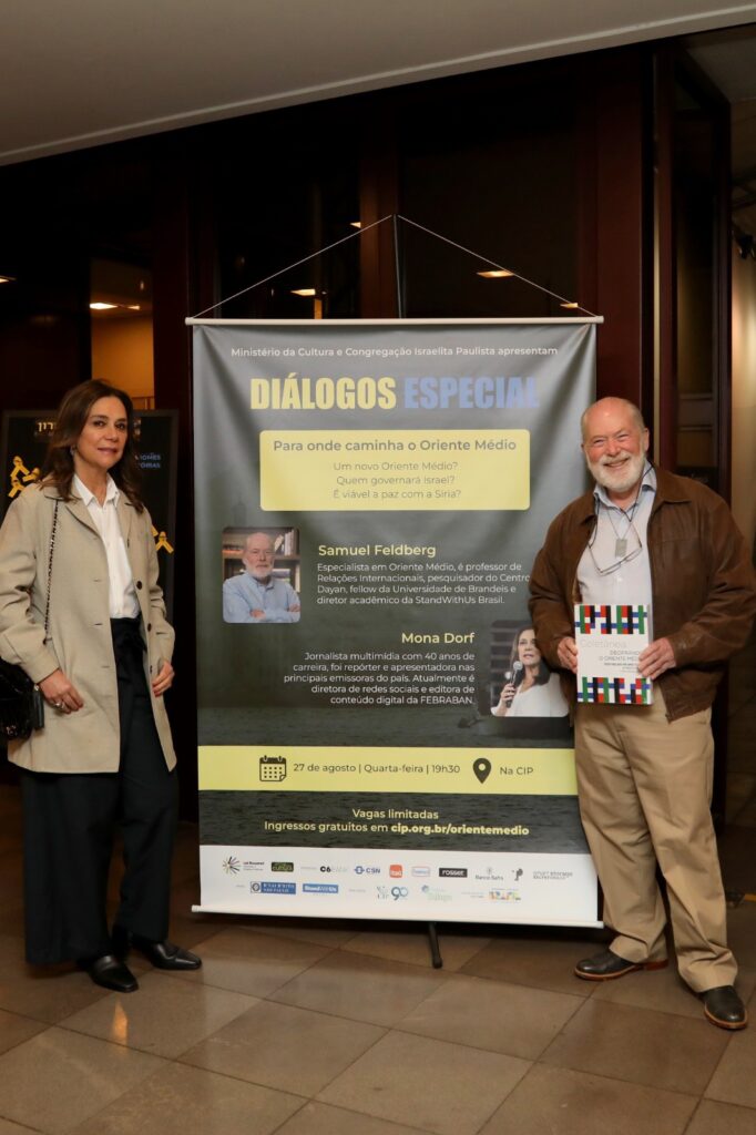 Na última quarta-feira, 27 de agosto, a Congregação Israelita Paulista (CIP) promoveu uma edição especial do programa Diálogos, trazendo para o centro da discussão o futuro do Oriente Médio. O convidado da noite foi o especialista em Relações Internacionais Samuel Feldberg, que atualmente divide seu tempo entre Brasil e Israel, com a mediação da jornalista Mona Dorf, referência na comunicação brasileira há mais de quatro décadas.