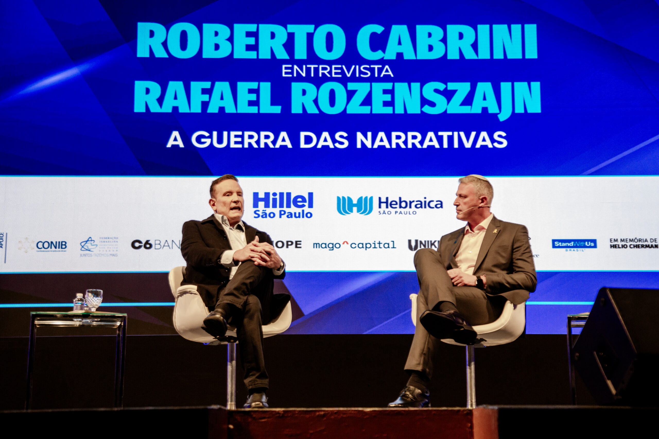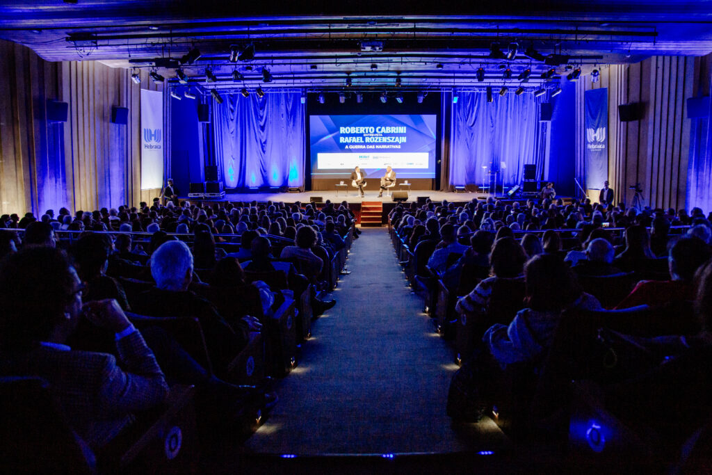 Na última terça-feira, 18, o clube A Hebraica, em parceria com o Hillel São Paulo, realizou o evento “Roberto Cabrini entrevista Rafael Rozenszajn – A Guerra das Narrativas”. O encontro ocorreu no Teatro Arthur Rubinstein e contou com aproximadamente 500 pessoas prestigiando o renomado jornalista Roberto Cabrini e o Major Rafael Rozenszajn, advogado e militar, que assumiu a função de porta-voz do Exército de Israel e lançou, recentemente, o livro “A Guerra das Narrativas”, trazendo informações sobre a Guerra ao Brasil.